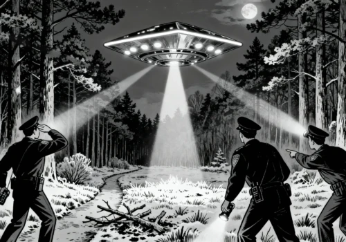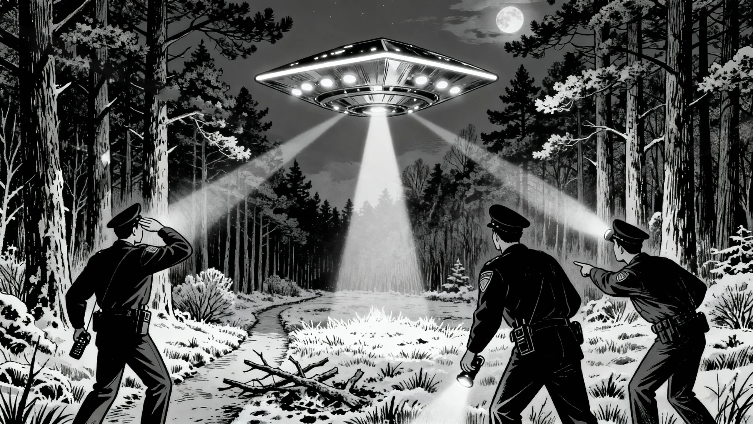 Penniston, joka johti ryhmää, päätti lähestyä valoa jalan. Kun hän saapui avoimelle alueelle, hän näki selvästi pienen, kolmiomaisen aluksen, joka seisoi maassa tai aivan sen yläpuolella. Sen pinta oli sileä ja metallinen, ja se hehkui sisältäpäin voimakasta valoa. Aluksen kolmessa kärjessä paloivat eriväriset valot — punainen, sininen ja valkoinen — jotka loivat ympärilleen oudon, sykkivän hehkun.